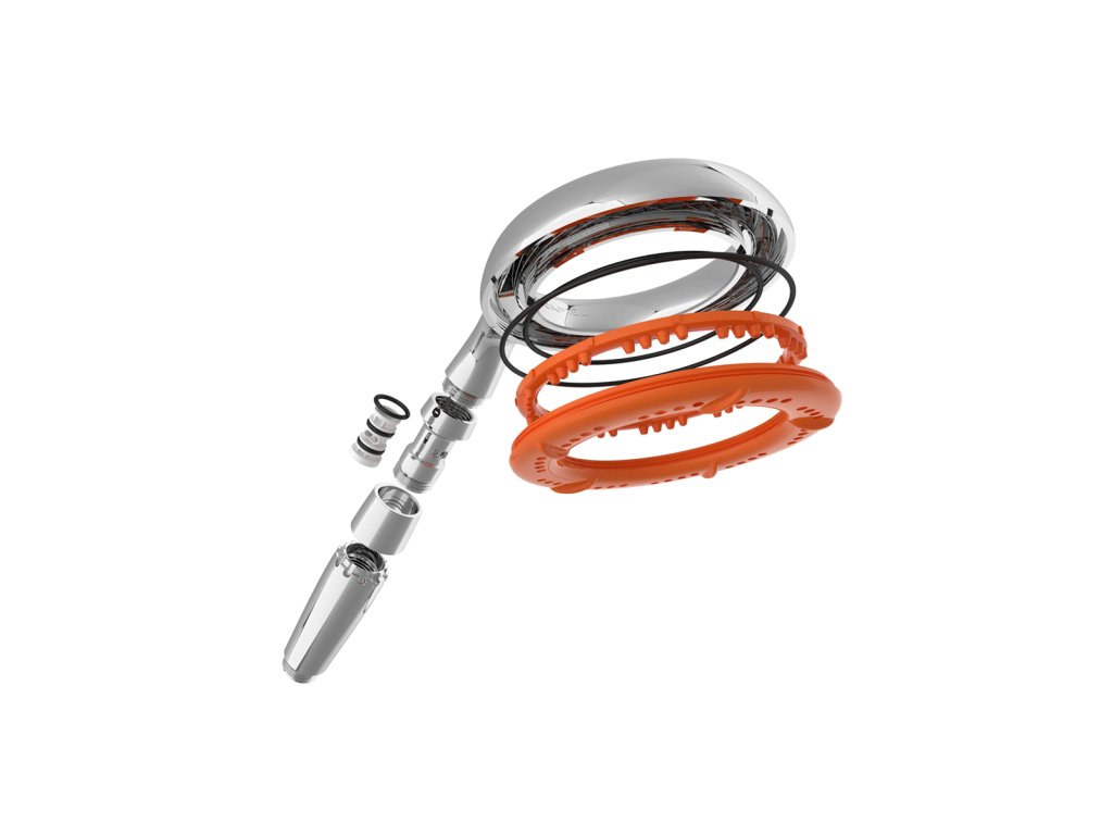 Sprchová hlavice Ecocamel Orbit přináší průlomový design a bezkonkurenční výkon. Deset shluků gumových trysek je uspořádáno v unikátním kruhovém vzoru (bicycle-spoke), což zajišťuje rovnoměrné a silné rozprašování vody.